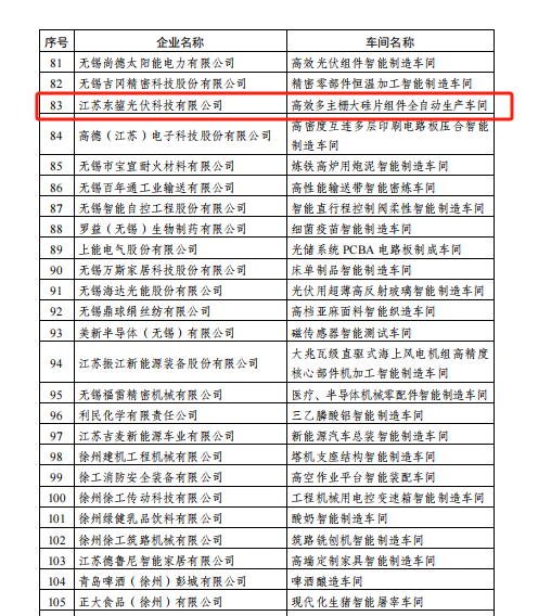 近日,(蘇工信投資[2022]342號)發布了2022年度江蘇省智能制造示范車間名單的通知,東鋆光伏的全自動化智能車間以先進的制造設備和嚴謹的管理當選。