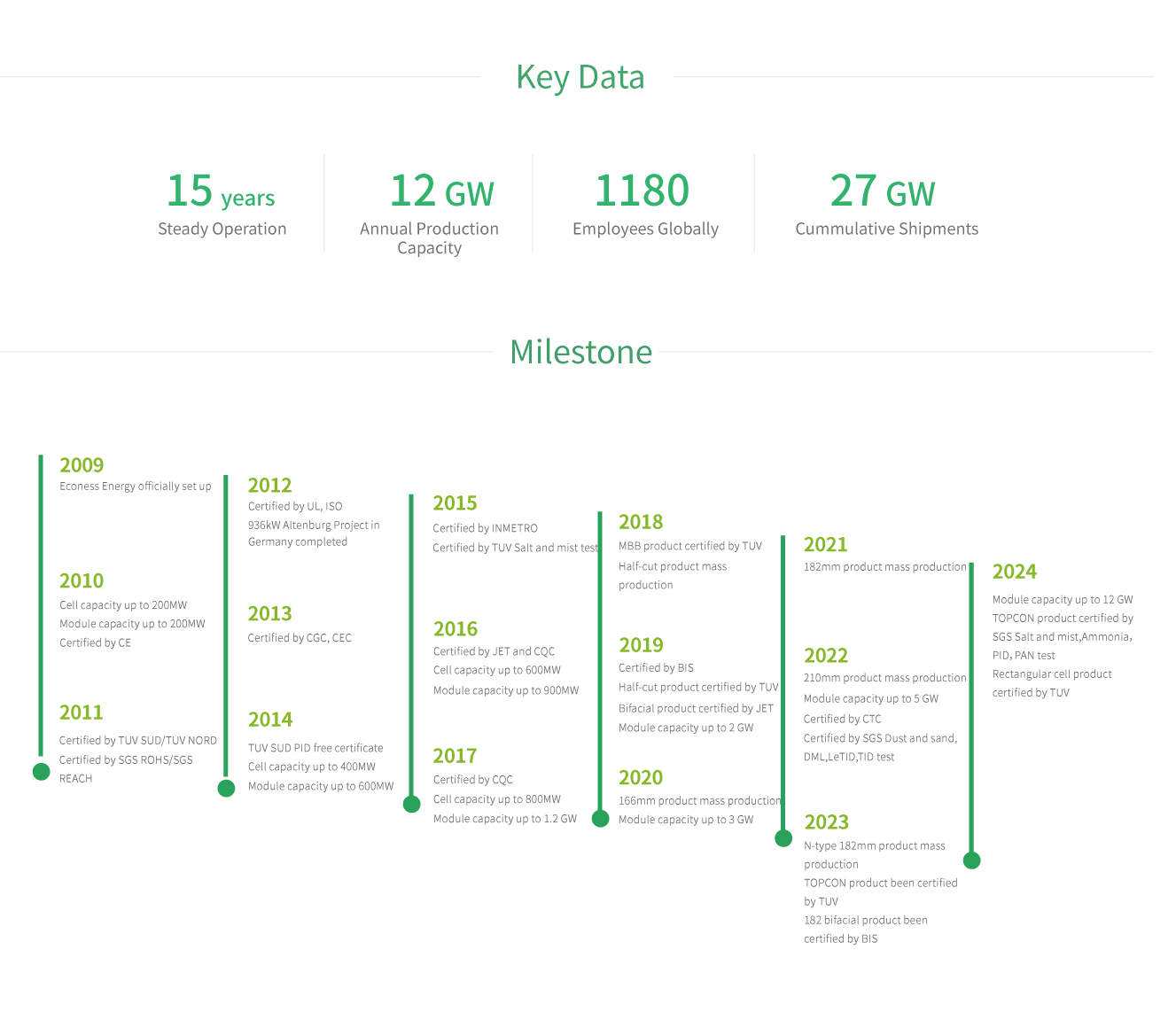 Established in 2009 , Econess Energy is engaged in PV power station development and PV module production. With current annual production capacity of  12GW modules, Econess Energy now distributes its PV products all over the world,such as Germany, Spain, Italy, France, India, Japan ect. As a strong, bankable partner, we are committed to building strategic, mutually beneficial collaboration with installers and developers.